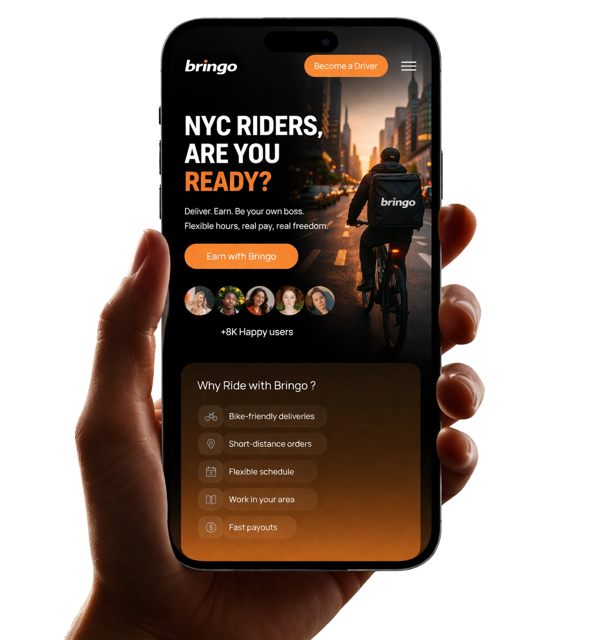 Bringo connects drivers with short-distance, on-demand delivery orders. Once approved, you can start accepting orders in your area and earning right away.